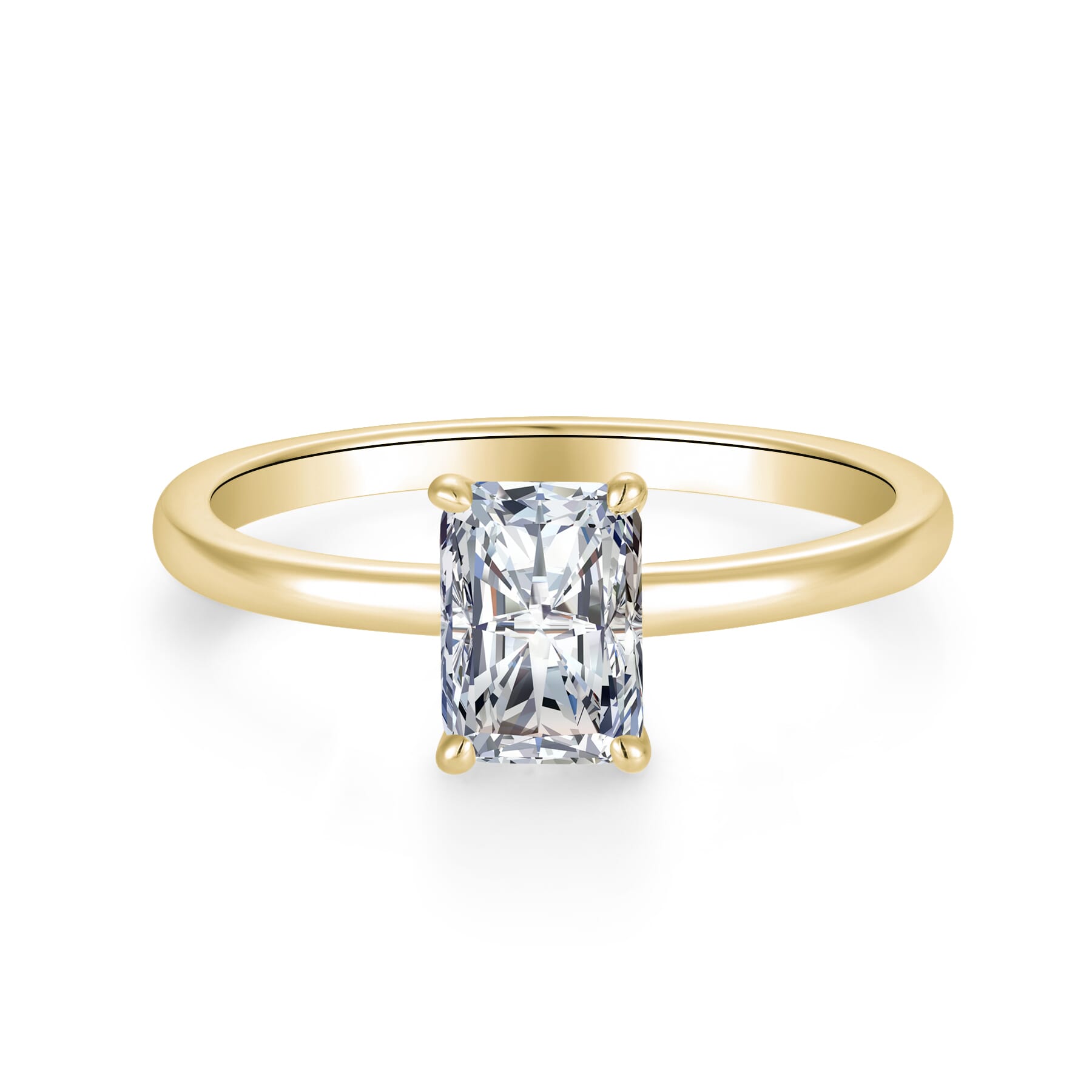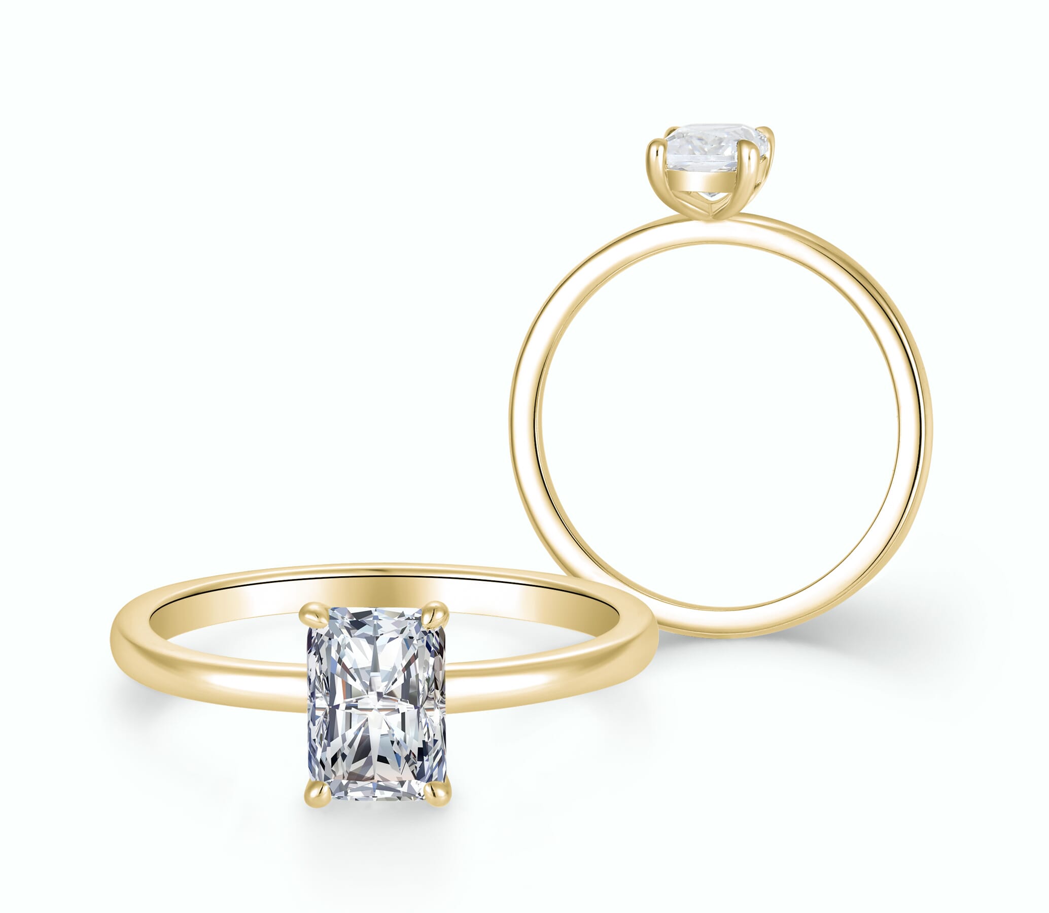Zeitloser Gelbgold-Solitärring mit 1 ct. Labordiamant im Radiantschliff (rechteckiger Brillant). Das geradlinige Design des Rings mit 4Krappen setzt den Diamanten schön in Szene und ist auch mit Eheringen sehr gut kombinierbar
